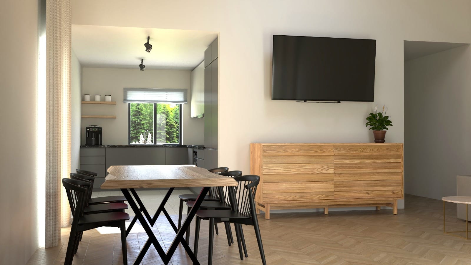 Lielie logi un izeja uz terasi nodrošina bagātīgu dabiskās gaismas plūsmu un rada patīkamu saikni ar dārzu, padarot māju gaišu un mājīgu. Ēkas ārējais dizains apvieno klasiskos koka apdares elementus ar mūsdienīgu formu, nodrošinot harmonisku saskaņu ar apkārtējo vidi.