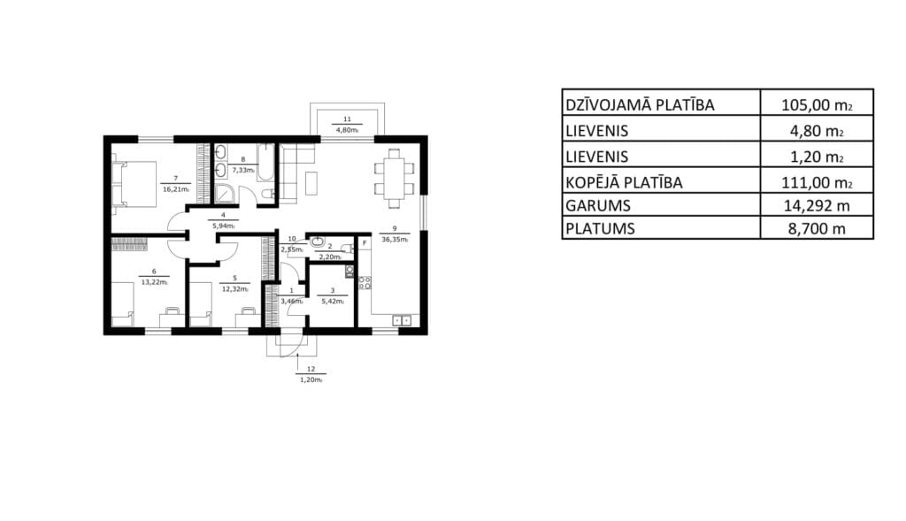 Šī moderna un kompakta viena stāva koka karkasa privātmāja ar pārdomātu plānojumu ir ideāla izvēle ģimenēm, kas novērtē komfortu un funkcionalitāti. Ar dzīvojamo platību 105 m² un kopējo platību 111 m², māja piedāvā trīs ērtas guļamistabas, plašu dzīvojamo zonu ar apvienotu virtuvi un ēdamzonu, kā arī divas vannasistabas, nodrošinot pilnvērtīgu un ērtu ikdienas dzīvi.
